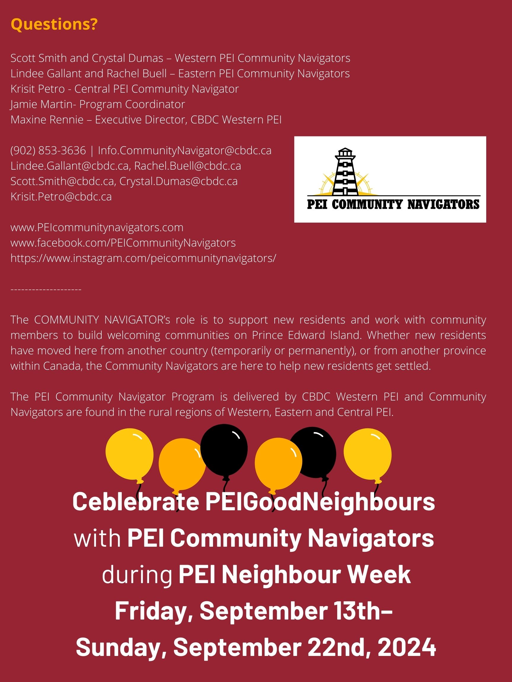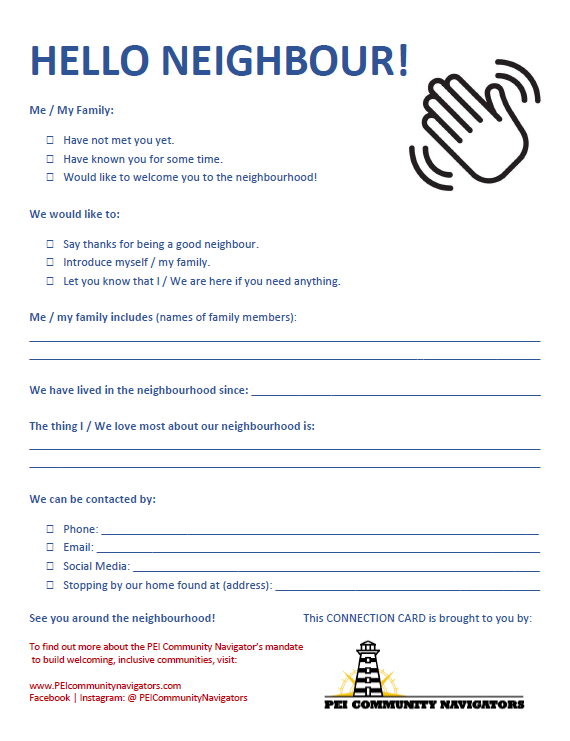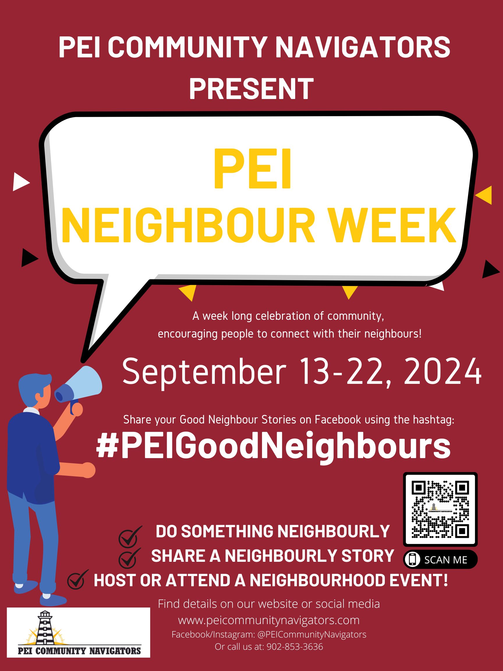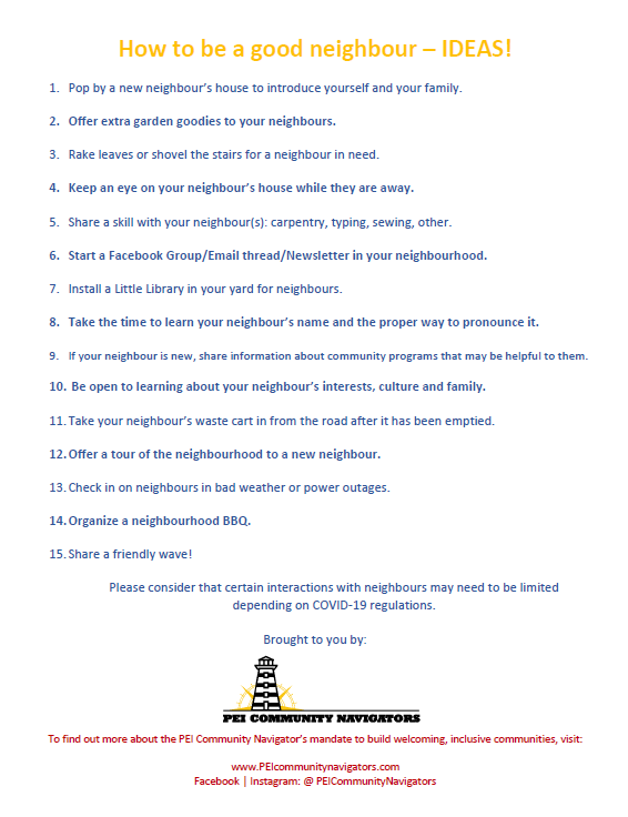 Community Members & Community Partners – celebrate 2024 PEI Neighbour Week with us! Planning a community event during 2024 PEI Neighbour Week? Reach out to the PEI Community Navigators for your rural region to see how they may be able to help!